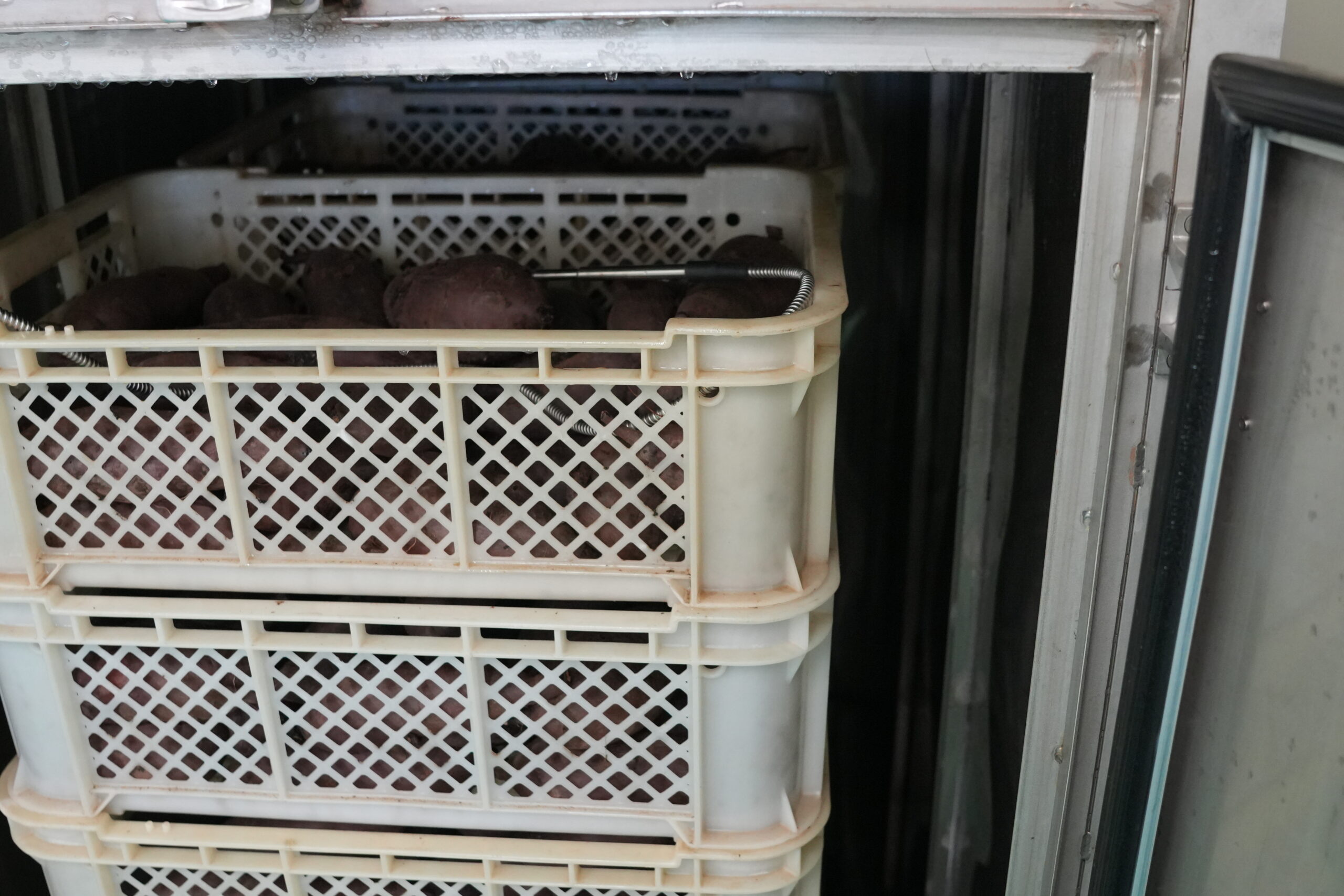 自社で培った技術を駆使しキュアリング処理(治癒処理)を行い更に一定温度環境下で60日以上貯蔵することでデンプンが分解し糖に変わり甘さが増します。